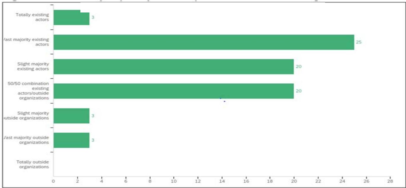 The survey asked: "Would you say that your region developed primarily from: totally existing actors; vast majority existing actors; slight majority existing actors; 50/50 combination existing actors/outside organizations; slight majority outside organizations; vast majority of outside organizations; totally outside organizations."