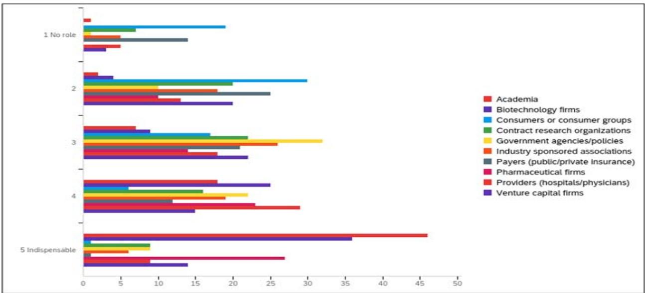 The survey asked: "Rank the actors' role played in developing the biopharmaceutical industry in your region (1 = no role; 5 = indispensable role).