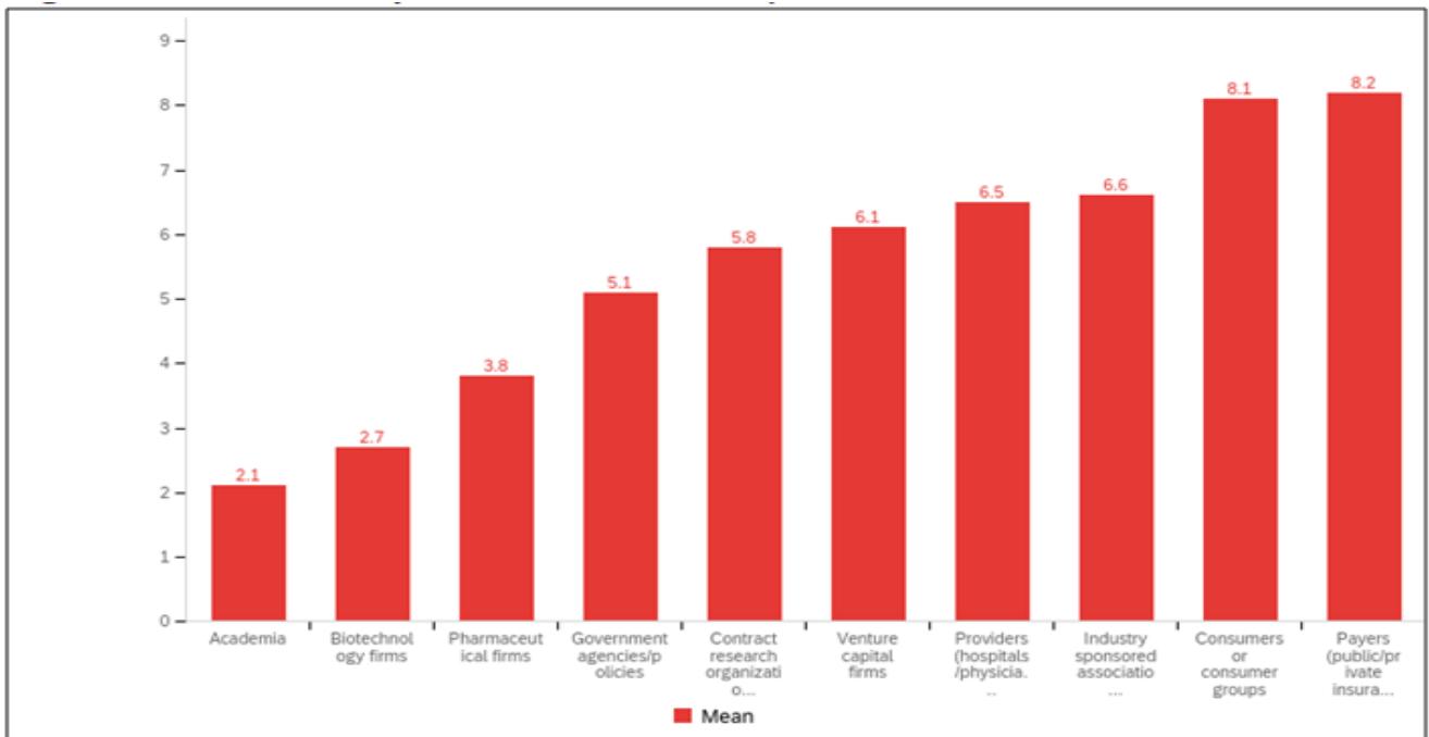 Figure 4 shows the rank order mean results for all regions combined—smallest bar is top ranking with there being 10 actors. Similar to Figure 3, academia and biotechnology firms are the top organizations overall which have played a role in the development of the ecosystems, with consumers and payers playing the least role. This remains true if we exclude respondents from academia and biotechnology firms (results not shown). For overall respondents, academia was the top category almost 56 percent of the time for all ecosystems' respondents combined. Pharmaceutical firms were ranked in the top category 25 percent of the time with biotechnology firms ranked in the top category only 10 percent of the time. However, biotechnology firms were in the second spot nearly 52 percent of the time. Consumers or consumer groups were in the last category (10) almost 40 percent of the time.