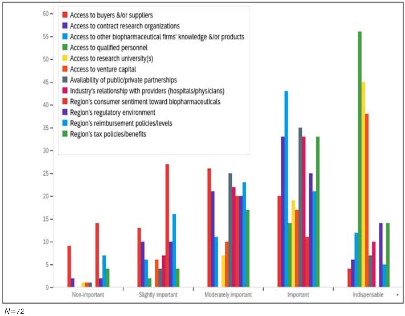 the respondents stated that access to venture capital was indispensable, with an additional 24 percent finding access to venture capital important. Keeping with this study's previous trends, almost 57 percent of respondents noted that the region's consumer sentiment toward biopharmaceuticals was either slightly or not important.