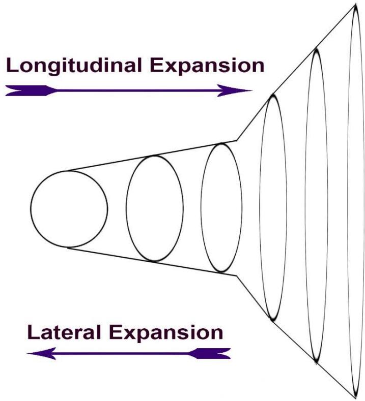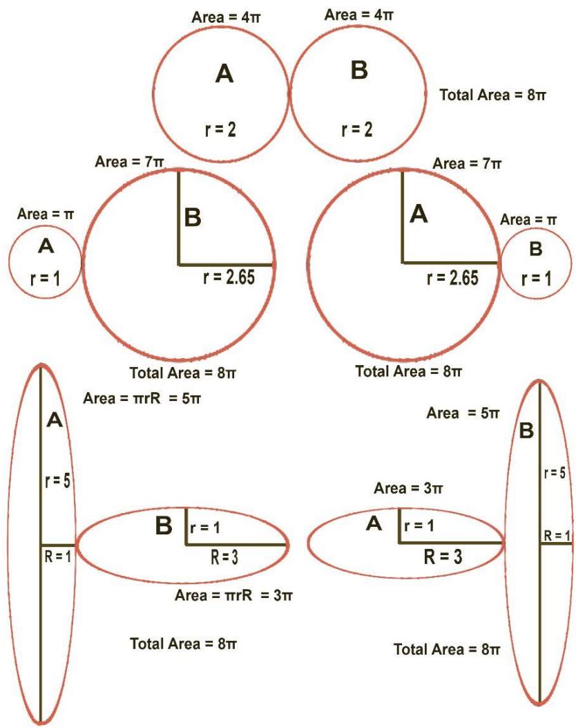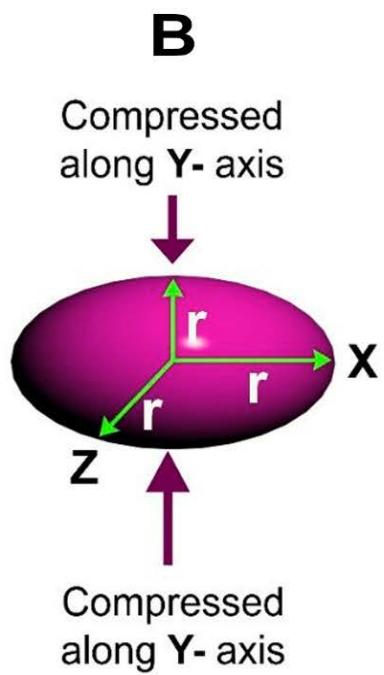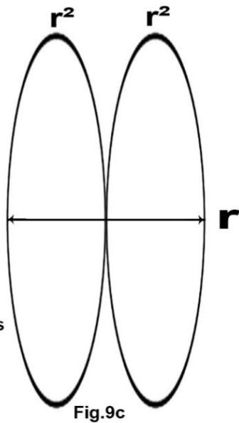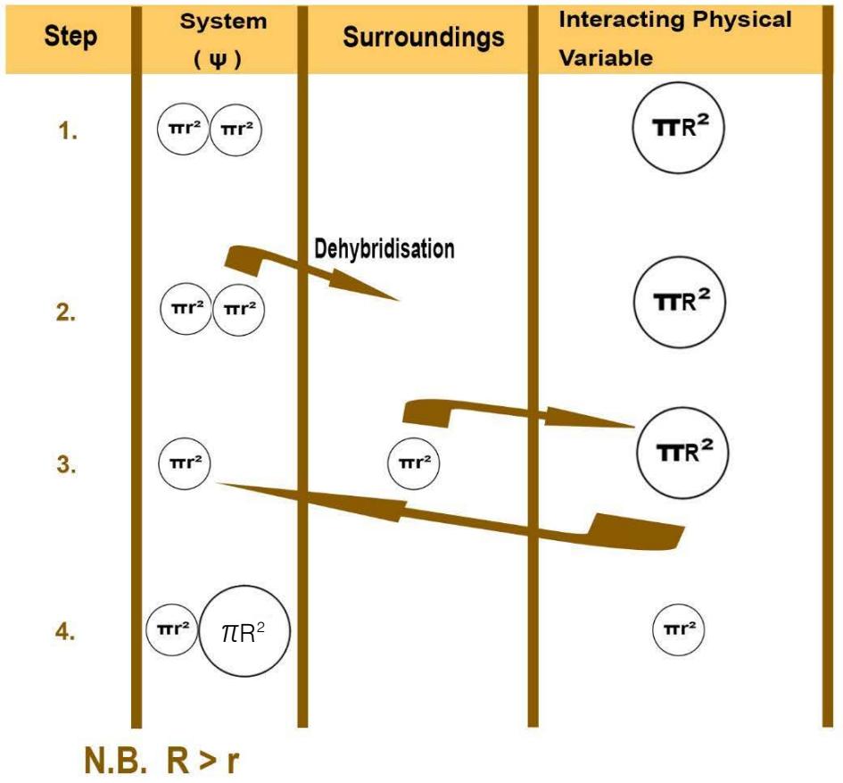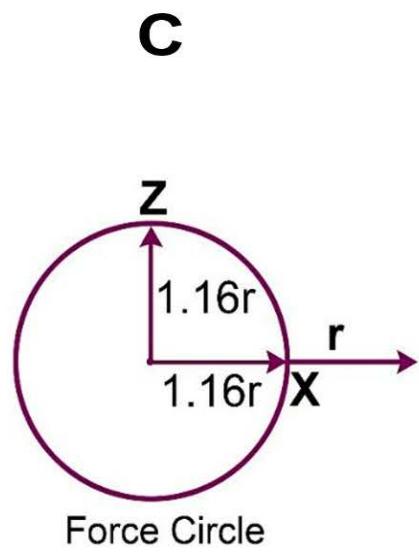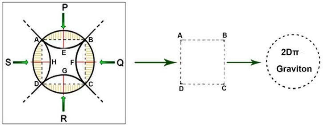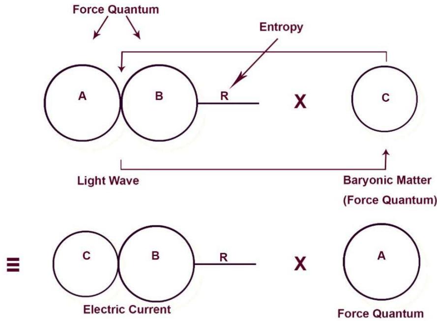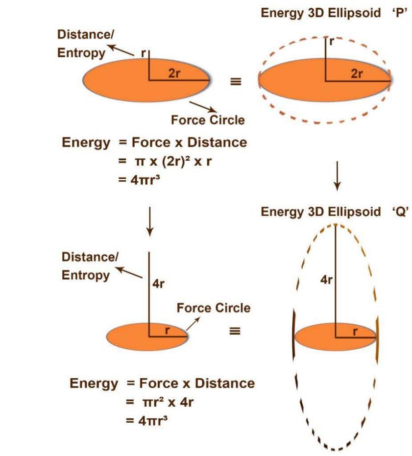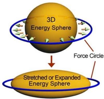 As shown in Figure (5) below [101], when each of the above said 3D sphere is squeezed, either through $x$, $y$ or $z$ axis, they turn into a force circle and one of the radius's (r) emerge out of the 3D sphere. In such situation the energy 3D quantum takes the shape of hybrid of 'force' and 'distance'. In Figure 5 below, the form 'A' is 'integrated' form, 'B' is the 'transitory' form and form 'C' is the 'differential' form of the energy quantum.[101]