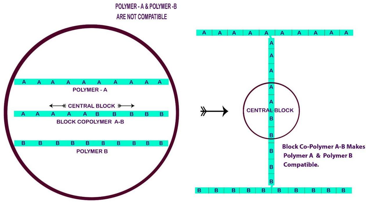 As a matter of fact mixture of different polymers are incompatible from the stand point of thermodynamics owing to their vanishing small entropy of mixing. So this entropic disfavored situation is counter balanced by using block co-polymers.Following the physical chemistry dictum like dissolves like', the block co - polymers are tailor made which contains the basic ingredients of the polymer mixture distributed over the 'different' or the 'multi' blocks. Each block of the co-polymer is compatibilizing one or the other polymer of the polymer mixture on the ground of both of them being chemically identical. This way, as a whole the mixture of the 'block co-polymer' and the 'polymer mixture' become an integrated, homogeneous and a compatible entity.