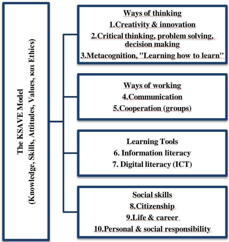 Binkley et al. (2012) developed the KSAVE model which is an acronym of the initial letters of the words Knowledge, Skills, Attitudes, Values and Ethics (Binkley et.al, 2012). Within the model they identified ten core skills necessary for $21^{\text{st}}$ century education, considering for each skill the dimensions of Knowledge, Skills, Attitudes, Values and Ethics.