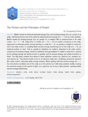 Changming Wang. 2026. \u201cThe Photon and the Principles of Matter\u201d. Global Journal of Science Frontier Research - A: Physics & Space Science GJSFR-A Volume 25 (GJSFR Volume 25 Issue A5).