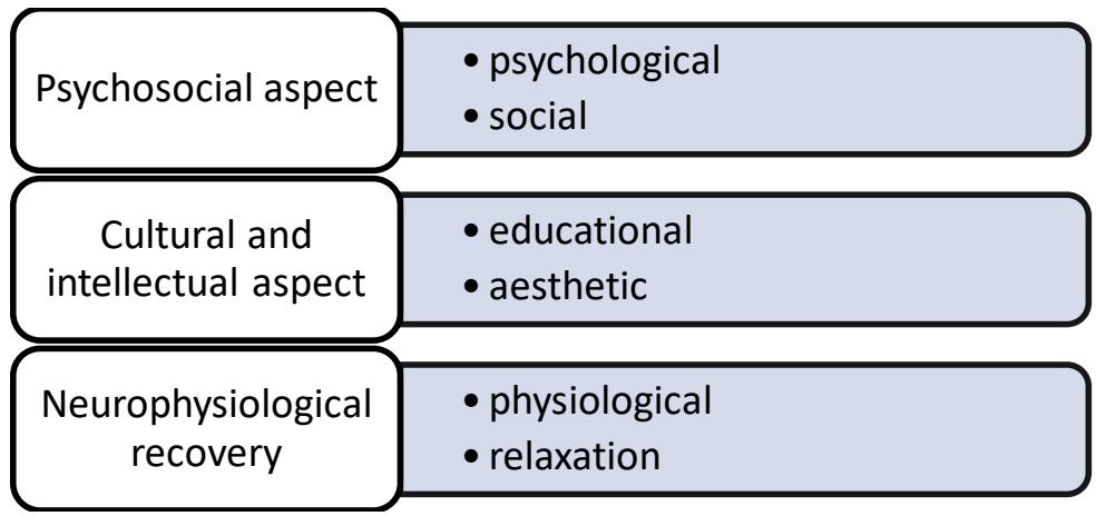 Winefield A. (2010) investigated the relationship between adolescent leisure participation and psychological well-being. They interpreted well-being as increased self-esteem and life satisfaction, positive mood states, and the absence of depression, anxiety and stress. According to research, it is clear that recreational activities, and leisure enjoyment in particular, can be influential in improving positive functioning expressed in self-esteem, psychological potential actualization, life satisfaction, and psychological well-being terms, with apparent relationships between them.