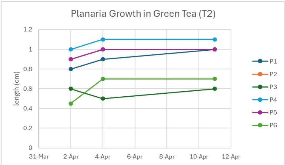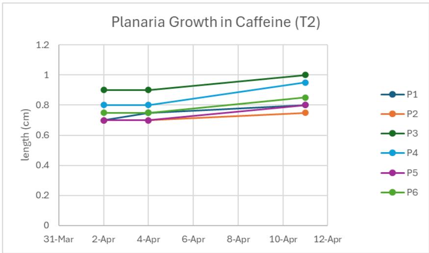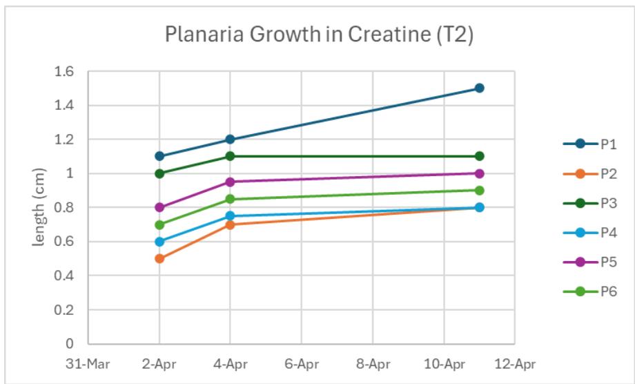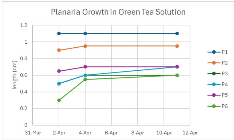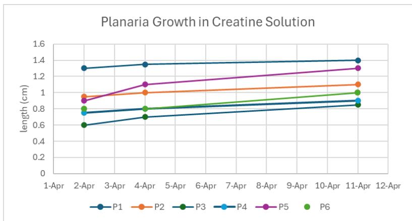Before starting the trials, the lethal dosage was tested for each solution. Planaria were found dead in the $10\%$ creatine solution, therefore making $5\%$ their lethal dosage. Planaria were able to survive in $15\%$ solutions of both green tea and caffeine. Planaria were measured before being split, then measured after being split in half. The length of the planaria were measured on Tuesdays and Thursday.