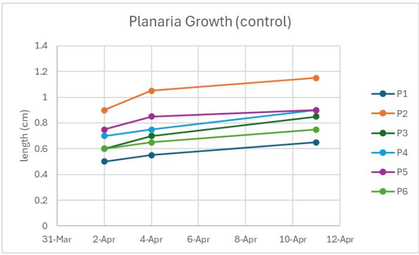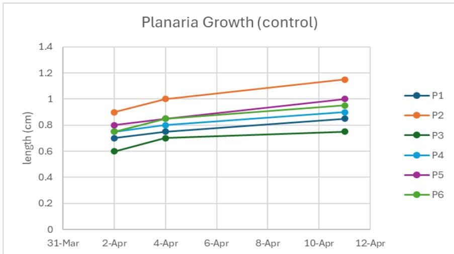 Figure 11: Three planaria were split into a total of six pieces and placed in spring water as the control. The table above shows the measurements taken over the nine days for the first trial