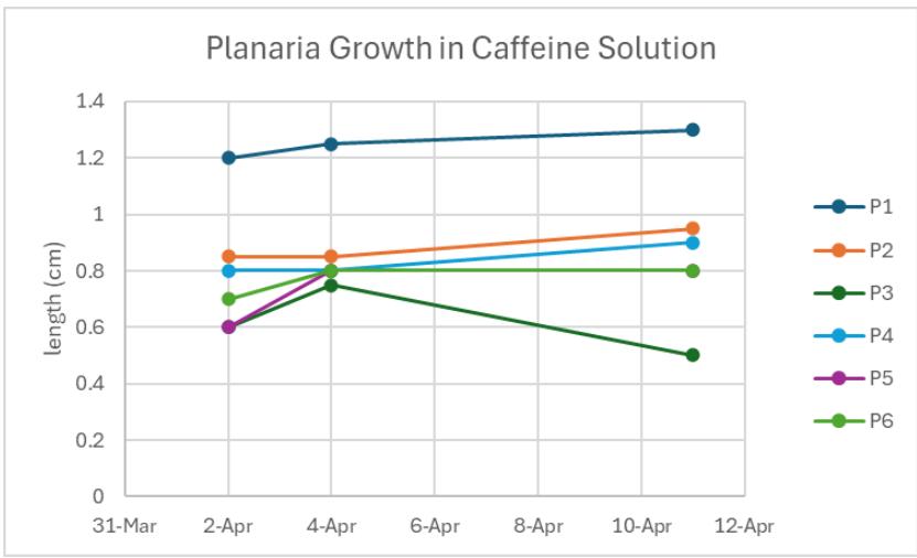 In their caffeine solution, they had noticed the main increase in growth being in the beginning but even for typical planaria most growth tends to occur in the beginning stages of regeneration so the growth from the creatine is not significantly impressive. Caffeine had originally been selected for its ability to increase activity. It is a stimulant and can increase circulation. These traits appeared promising as planaria already possess regenerative potential, it could speed up its regeneration time. The caffeine had not met the expectations and showed negative effects on the planarian's regeneration time as the average growth of the planaria in spring water was still higher than with the caffeine solution. During the error trials, they had noticed the activity of the planaria in a concentration that ended up lethal be a lot more active than the planaria in the other solutions. After the set experiment concentrations, the planaria in the creatine solution became the most active. During one of the data collection labs, the researchers noticed that the planaria in the caffeine solution had decreased as much as it has increased in the collection lab before.