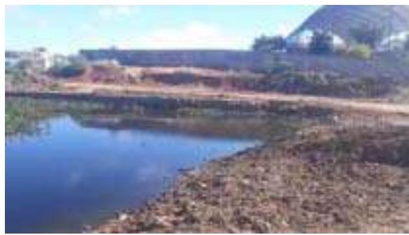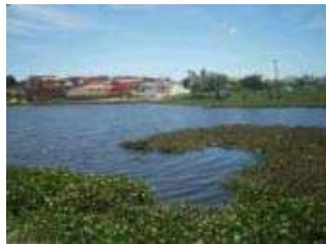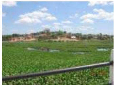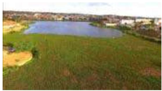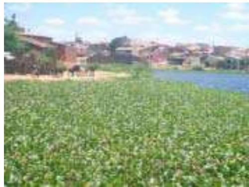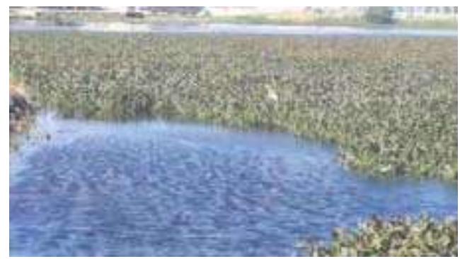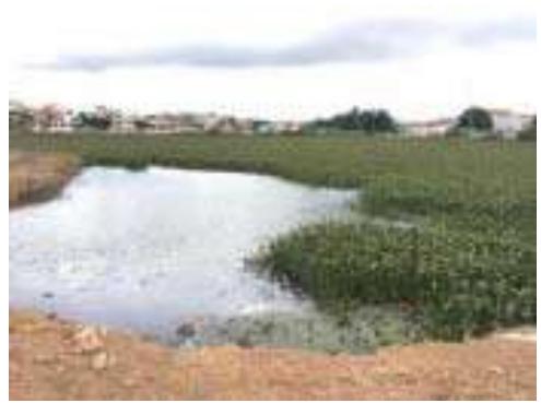 Na imagem 1 é possível verificar que a água do açude é quase completa de uma planta conhecida como aguapé. Essa espécie de planta tem uma alta proliferação pois ela cresce se alimentando de composto orgânico e em lagos, rios e açudes que são contaminados por despejo de efluentes ela nasce e se reproduz por todo o espelho d'água.