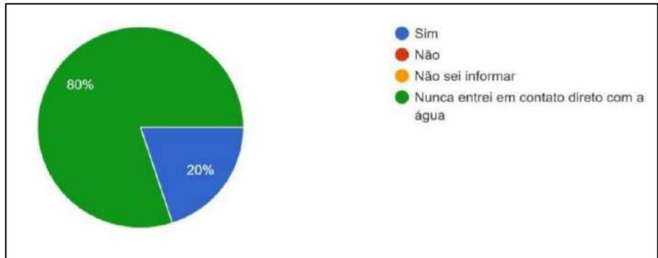 Fonte: Pesquisa direta Gráfico 1: Mal-estar após contato com a água do açude As respostas sobre sentir algum mal estar depois de entrar em contato com a água do açude, $80\%$ respondeu que nunca entraram em contato direto com a água, mas $20\%$ assinalou Sim, que já tinham sentindo alguma reação depois do contato com a água, pois apesar da maioria evitar ainda tem gente que entra na água para tentar pescar algo, acham que a água está limpa e eventualmente sentem algum tipo de mal estar como diarreia, tontura, dor de cabeça ou em pior dos casos algum tipo de doença relacionada a esgoto não tratado como dengue, hepatite A, leptospirose.