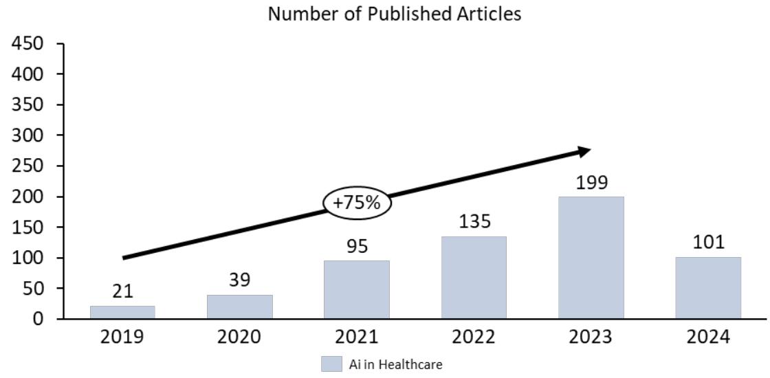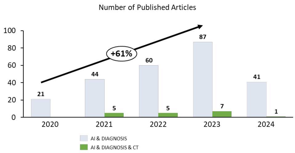 Due to the broad application this technology has, it is expected that when refining the search by inserting the term "Diagnosis" a smaller number of articles is taken as a result but even after selecting a more specific application of Artificial Intelligence, the annual growth rate in the number of articles remains above $60\%$.