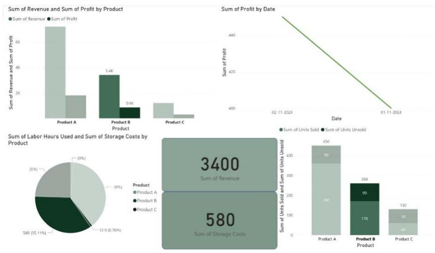<table><tr><td>Date</td><td>Product</td><td>Units Sold</td><td>Units Unsold</td><td>Revenue</td><td>Cost</td><td>Profit</td><td>Labor Hours Used</td><td>Storage Costs</td></tr><tr><td>2024-11-01</td><td>Product A</td><td>120</td><td>30</td><td>2400</td><td>1800</td><td>600</td><td>8</td><td>200</td></tr><tr><td>2024-11-01</td><td>Product B</td><td>80</td><td>50</td><td>1600</td><td>1200</td><td>400</td><td>6</td><td>300</td></tr><tr><td>2024-11-02</td><td>Product A</td><td>100</td><td>50</td><td>2000</td><td>1500</td><td>500</td><td>7</td><td>250</td></tr><tr><td>2024-11-02</td><td>Product B</td><td>90</td><td>40</td><td>1800</td><td>1350</td><td>450</td><td>6.5</td><td>280</td></tr><tr><td>2024-11-03</td><td>Product C</td><td>60</td><td>70</td><td>1200</td><td>900</td><td>300</td><td>5.5</td><td>400</td></tr><tr><td>2024-11-03</td><td>Product A</td><td>140</td><td>10</td><td>2800</td><td>2100</td><td>700</td><td>9</td><td>180</td></tr></table>