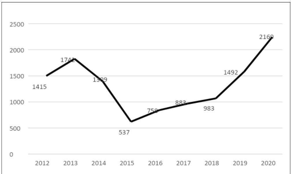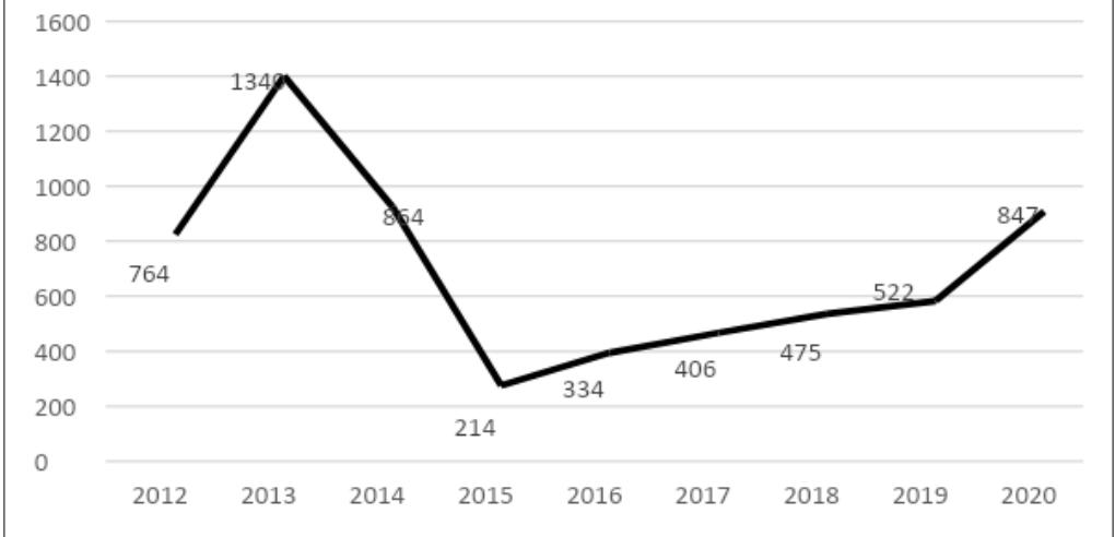 No entanto, a FIB não conseguiu criar um ambiente no qual a população civil se sentisse segura para voltar para casa. Com relação a esse aspecto, a ONU (2020) considera a diminuição do número de deslocados internos como um indicador-chave de PoC capaz de medir a sensação de segurança da população local. Assim, a redução do número de deslocados internos significa que a população civil se sente menos vulnerável à violência. O gráfico abaixo mostra o número total de deslocados internos entre 2012 e 2020, considerando apenas a província de Kivu do Norte, onde a FIB foi implantada desde 2013: