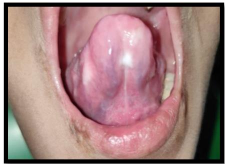 Figure 2: Intraoral examination (a&b) Multiple carious teeth, poor oral hygiene, (c&d) Diffused whitish mucosal lesions seen on the dorsal and ventral aspect of tongue, Labial soft tissue deformity of the patient due to biting