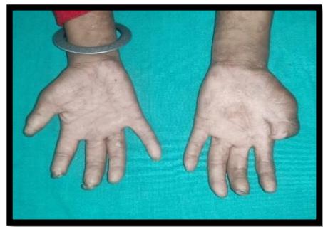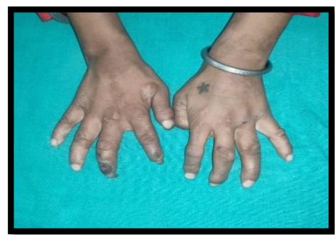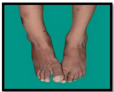 Figure 1: (a) Healing scars on face, (b&c) Foreshortening of distal phalanges of hand (d) Multiple burn scars on leg (a)