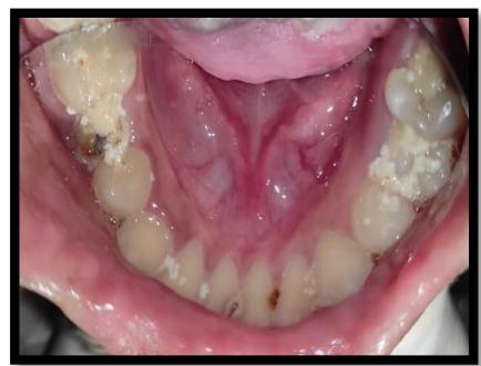 Intraoral examination revealed generalized attrition of teeth, early carious lesions in the posterior teeth with no complaints of sensitivity or pain, multiple areas of soft tissue scarring on the inner lips and buccal mucosa, no other visible pathologies or acute dental issues were noted as shown in Figure 2.