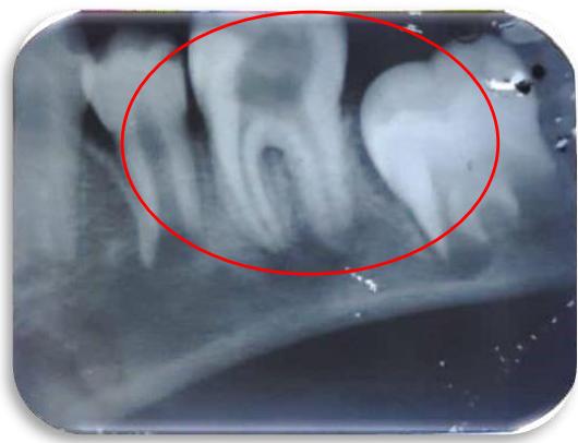 Figure 3: Radiolucency involving enamel, dentin and pulp, loss of lamina dura in mesial and distal root, diffused periapical radiolucency with mesial and distal root i.r.t 46