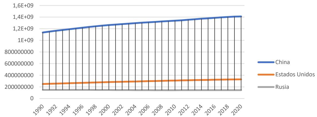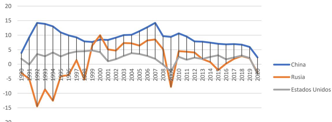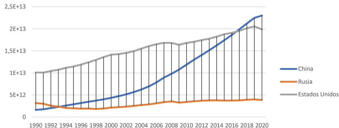crecimiento. Si se compara el PBI de China con el de los EE. UU., este pasó de representar el $16\%$,en 1990, al $116\%$ en 2020, mientras que, el de Rusia pasó del $31.5\%$ del de EE. UU., en 1990, al $19.51\%$ en 2020, evidenciando un claro retroceso en términos relativos15.