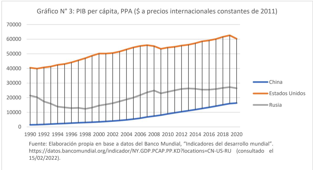 Fuente: Elaboración propia en base a datos del Banco Mundial, "Indicadores del desarrollo mundial". https://datos.bancomundial.org/indicador/NY.GDP.PCAP.PP.KD?locations=CN-US-RU (consultado el 15/02/2022).