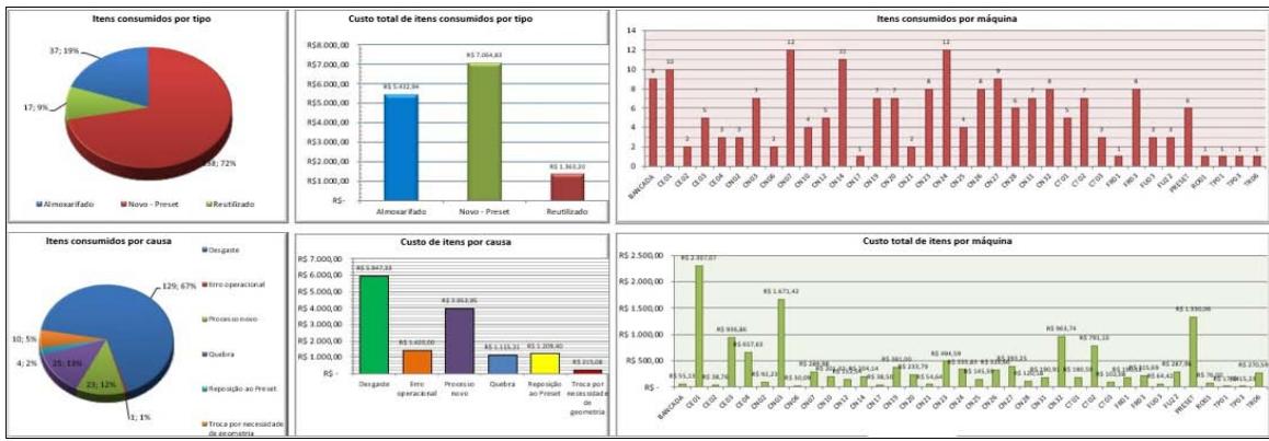 A partir da compilação dos dados, estruturouse uma planilha digital a ser preenchida no setor, na qual permite identificar dados de máquinas, operadores, custos, quantidades e causas potenciais para solicitação de um item novo. Ao solicitar um item, o responsável do setor preenche os dados no computador e tais informações geram gráficos em tempo real que são armazenados em um banco de dados. Estes gráficos automaticamente constituem um Dashboard o qual somente gestores e supervisores tem acesso. Alguns gráficos presentes no Management Dashboard podem ser visualizados na Figura 1.