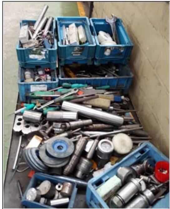 Deste modo, para otimizar a bancada de trabalho, mapeou-se as necessidades de cada posto de trabalho baseando-se em seus produtos de fabricação e fez-se uma coleta dos materiais e ferramentas, permanecendo na área somente o que fosse realmente necessário. Na limpeza de 18 postos de trabalho, coletou-se 612 itens, entre ferramentas, insertos, lixas, parafusos, pinças e chaves os quais foram devolvidos ao Preset. Além disso, também foram descartados aproximadamente 50 kg de materiais danificados e sucateados, conforme a Figura 3.