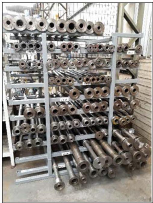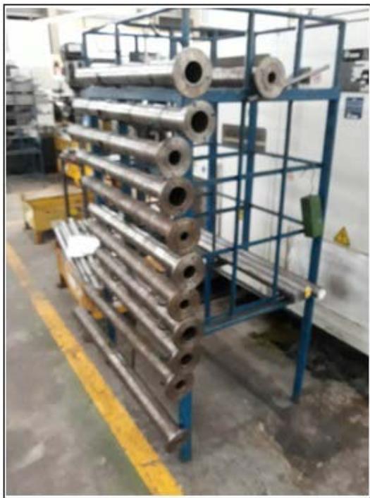 Cada torno CNC de usinagem dispõe de um conjunto de redutores os quais são usados para introduzir e fixar as barras na máquina para realizar as operações. Cada redutor possui características específicas e, por esta razão, são utilizados para fabricar produtos específicos. Assim sendo, ao lado de cada máquina há uma estrutura para alocar os redutores utilizados na respectiva máquina. Entretanto, muitos redutores que ainda eram mantidos nas estruturas estavam obsoletos, pois as peças as quais este fabricava já haviam saído de linha. Além disso, não há nenhuma identificação dos redutores, fazendo com que algumas vezes o operador despendesse algum tempo para identificar o redutor que seria necessário para a operação. A Figura 4 demonstra uma estrutura com redutores ao lado de um torno CNC.