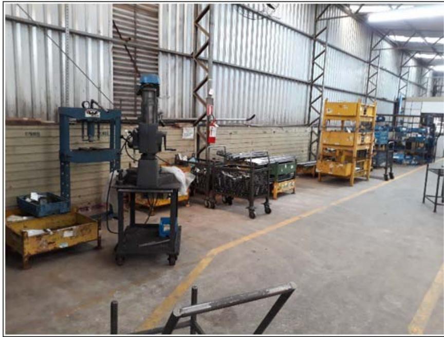 Os caixotes de matérias primas anteriormente eram alocados diretamente nos postos de trabalho, gerando acúmulo e obstrução de espaços, desorganização e falta de controle de tais materiais. Caso não haviam mais espaços vagos para esta alocação nos postos de trabalho, as matérias primas eram disponibilizadas em uma área no fundo da fábrica, sem organização ou ordenação e juntamente com outras máquinas ou equipamentos. A Figura 7 demonstra a área situada no fundo da fábrica ocupada com matérias primas, máquinas e materiais de descartes.