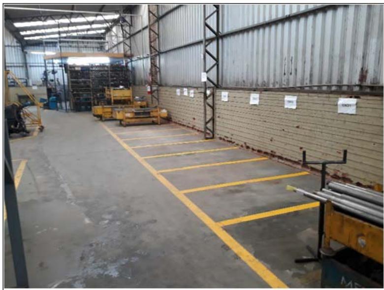 Para estimular e iniciar a produção puxada, estabeleceu-se um novo método de trabalho, na qual o material oriundo do Corte é alocado em uma área no fundo da fábrica separado por tipo de máquina através de baias e organizado sequencialmente conforme a programação. A Figura 8demonstra a otimização da área e as demarcações das baias para alocar as matérias primas conforme a máquina. Destaca-se ainda que estas baias estão identificadas para agilizar e facilitar a sua identificação.