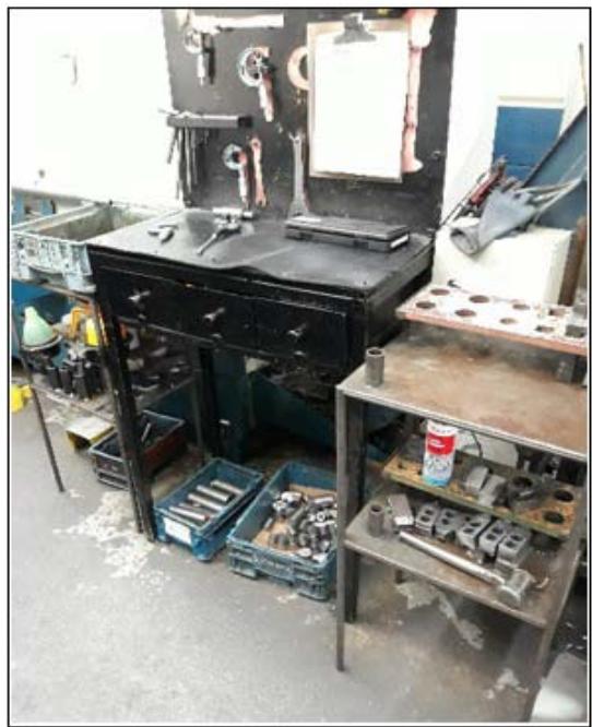 Todos os postos de trabalho do setor de Usinagem possuem uma bancada de trabalho. No entanto, esta bancada não possui padronização e há excesso de materiais e ferramentas desnecessárias, que acabam mantendo o setor desorganizado. A Figura 2 demonstra um exemplo de bancada em um dos postos de trabalho.