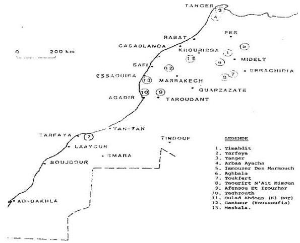 The distribution of oil shale deposits in Morocco is shown in the figure (Fig. 1) below: