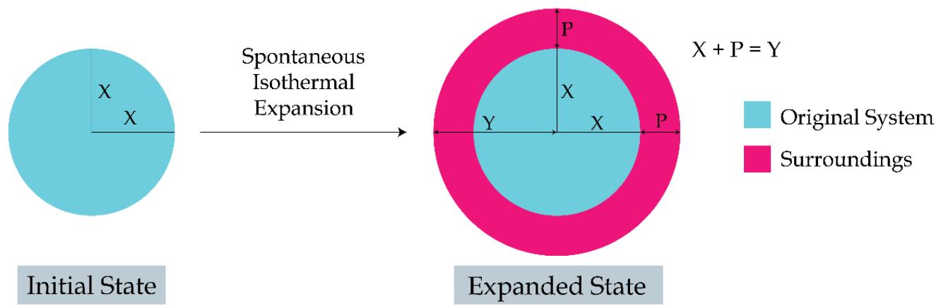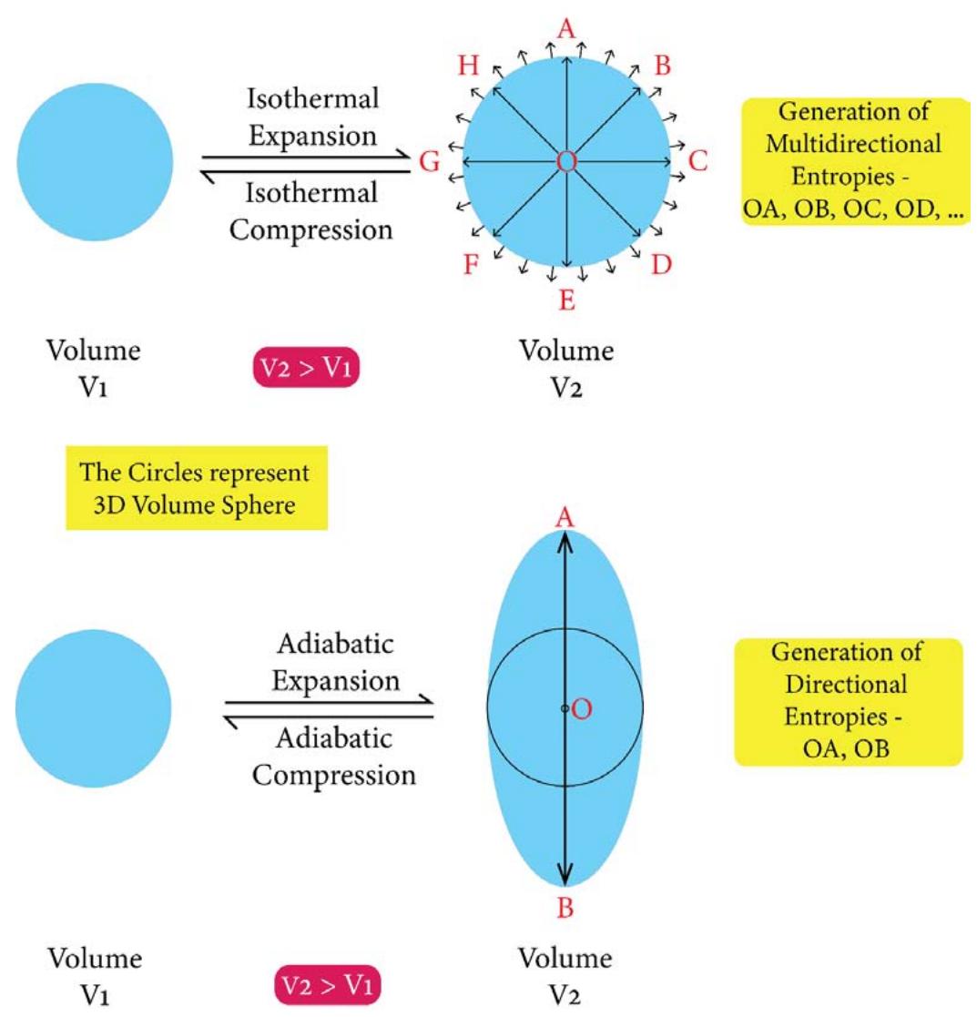 All these are well described through pictorial representation in Figure 6. The volumes of the circles of the U part increase in size when the internal energy increases or decreases in size when the internal energy decreases. On the other hand, the PV part (principally the thermodynamic order creating part) can not only increase or decrease in size homogeneously over all the directions in space but also can be stretched or distorted longitudinally or laterally such that they can encroach the entropy of surroundings and that too directionally and attain the shapes of homogeneous or in homogeneous ellipsoids and would yield the 'thermodynamic work' better. For example if a glass of water (which is kept at ambient temperature under the normal atmospheric pressure) is transferred to a narrower width glass cylinder (at the ambient temperature only and the atmospheric pressure remaining the same), since the average path length of travel of the molecules are increasing and the system is encroaching the space of the surroundings, and are forced to move in ordered and directional manner, the directional entropy would increase and creating such situations one can generate more 'thermodynamic work' and this will be elaborated later in this article.