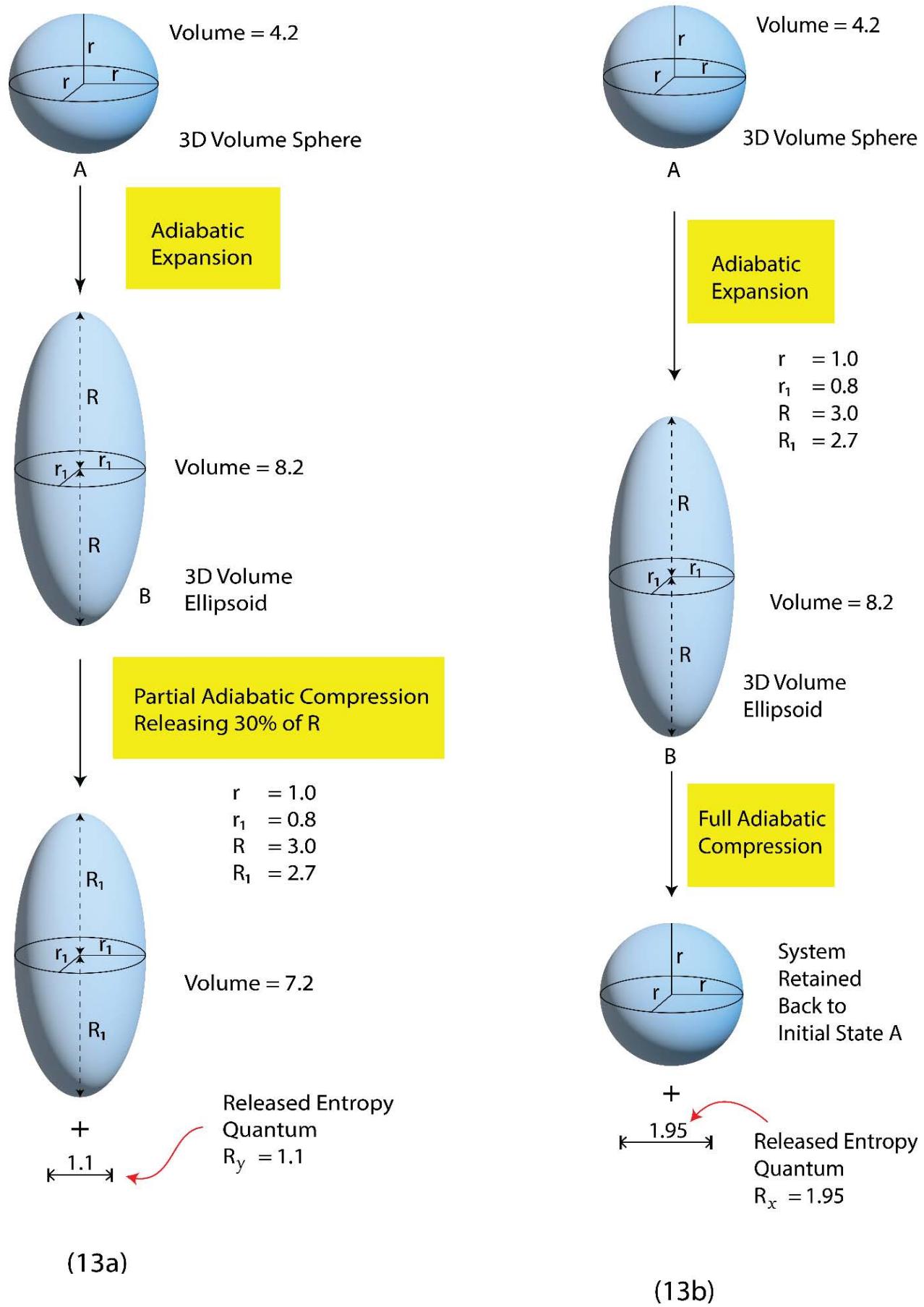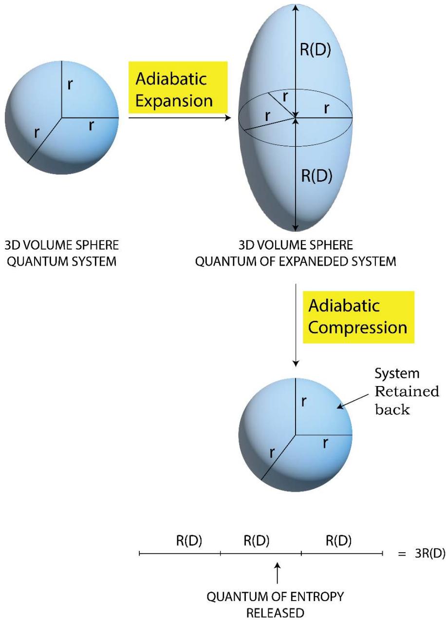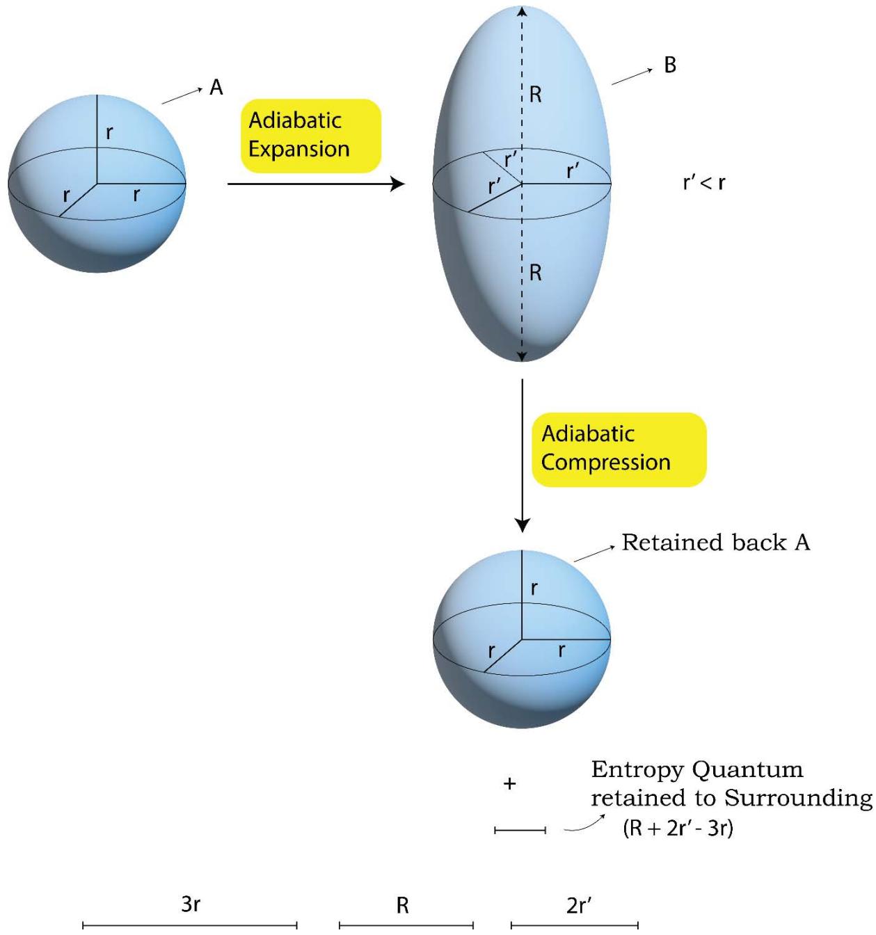 From the above Figure, it is clearly revealed that while the force circles are squeezed by their areas by say $55.5\%$ (as for example), the length of the directional entropy quantum (R) increases by about $80\%$ but such occurrence leads to an overall diminution in internal energy by about $20\%$.
