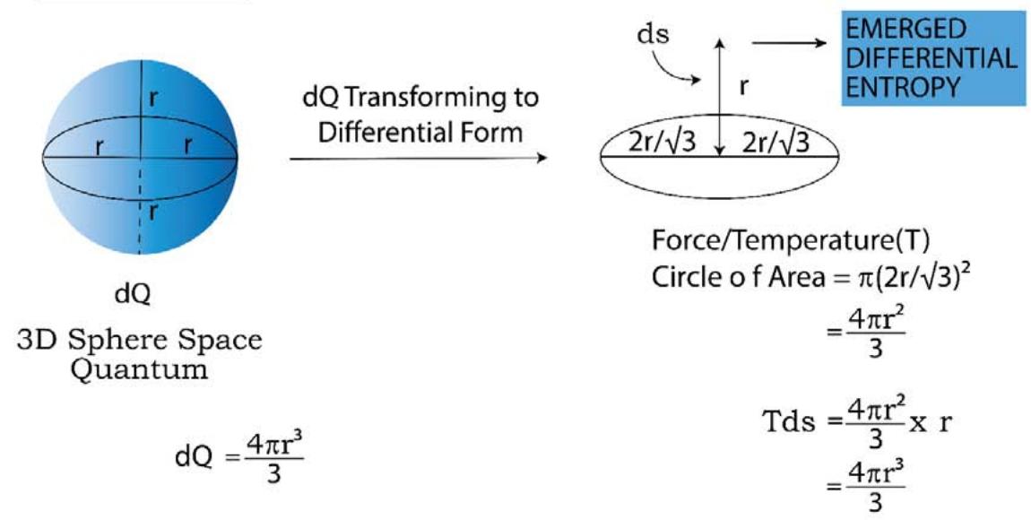 The difference between 'disorder' and 'order' is, the former one is multi directional and the latter is unidirectional. While 'energy' or 'randomness' is multi directional, 'work' is uni - directional and in the language of TSQ, the 'energy' or 'heat' is in the integrated or hybrid form and the 'work' is the differential form of 'heat' or 'energy' as shown in Figure 3. In the said figure 3, it is pictorially presented, how a quantum of 'energy' or 'heat' splits into a 'force' quantum and a quantum of 'directional entropy'. While in the heat or energy integrated sphere, the quantum of entropy is multidirectional, the same entropy quantum is unidirectional in the differential form of heat (thermodynamic work).