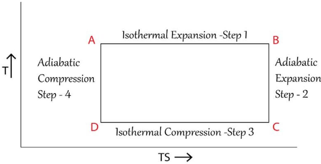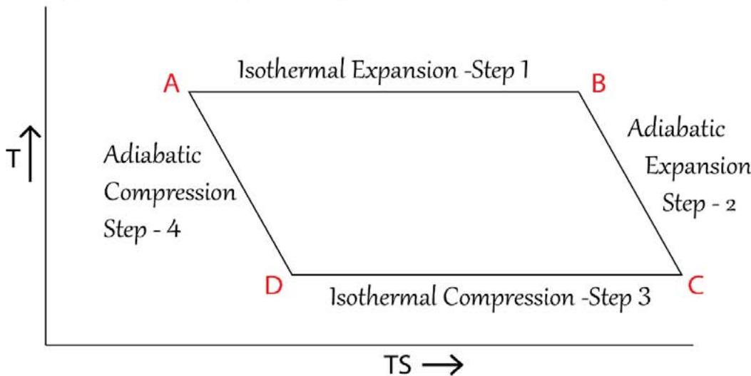 Temperature(T) - Temperature x Entropy (TS) Diagram of a Typical Carnot Cycle -As per Conventional Thermodynamics Figure 18: 'Temperature' (T) versus 'Temperature - Entropy' (TS) Diagram of a Typical Carnot Cycle as per TSQ and the Conventional Thermodynamics While in the isothermal expansion and compression steps, the magnitude of TS increases and decreases respectively (and the increase and decrease of the magnitude TS remains to be same), in the adiabatic expansion and compression steps, the magnitude of TS remain stagnant but the magnitude of TS remains to be higher in case of the adiabatic expansion compared to the adiabatic compression. These are explained below more explicitly: