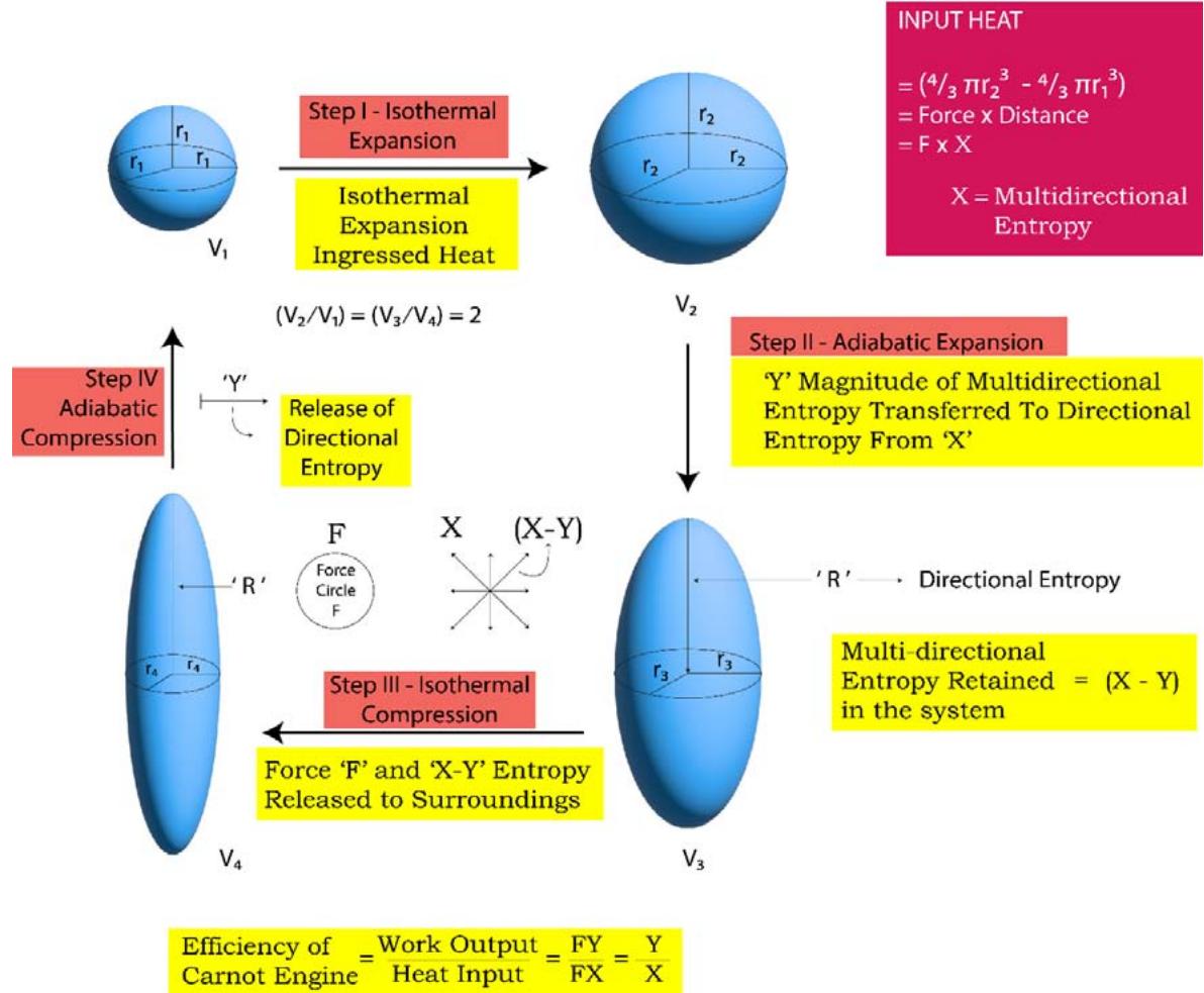 7) The 'quantum of force' which is released in the step 3 and the 'quantum of directional entropy,' 'Y' which is released in the step 4, combines with each other and forms a 'quantum of differential heat, FY' and which is the 'thermodynamic work output' of a typical Carnot cycle.