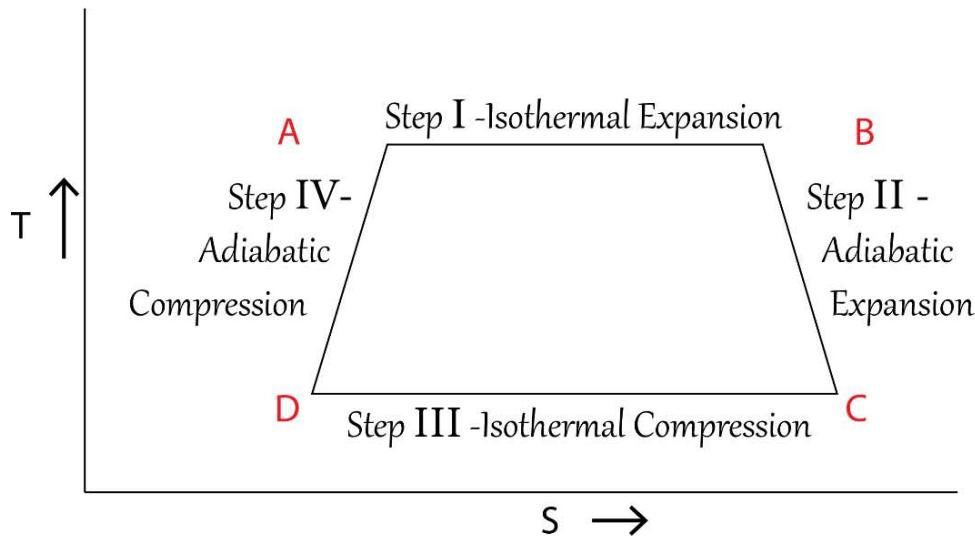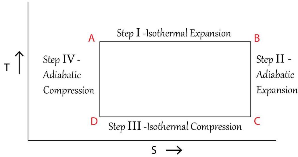 Increase in the value of 'TS' of $1^{\text{st}}$ isothermal expansion = Decrease in the value of 'TS' of the $2^{\text{nd}}$ isothermal compression ii) In the 1st adiabatic expansion step, the value of T does go on decreasing and the value of S does go on increasing up to a certain extent respectively. In the $2^{\text{nd}}$ adiabatic compression step, the value of T does go on increasing and the value of S does go on decreasing. The 'Carnot cycle is so designed' such that the above said decrease and increase of T and S respectively in the $1^{\text{st}}$ adiabatic expansion and the increase in T and the decrease in S respectively in the $2^{\text{nd}}$ adiabatic compression are very much proportionate to each other such that the composite variable 'TS' remain to be constant in the said adiabatic steps.