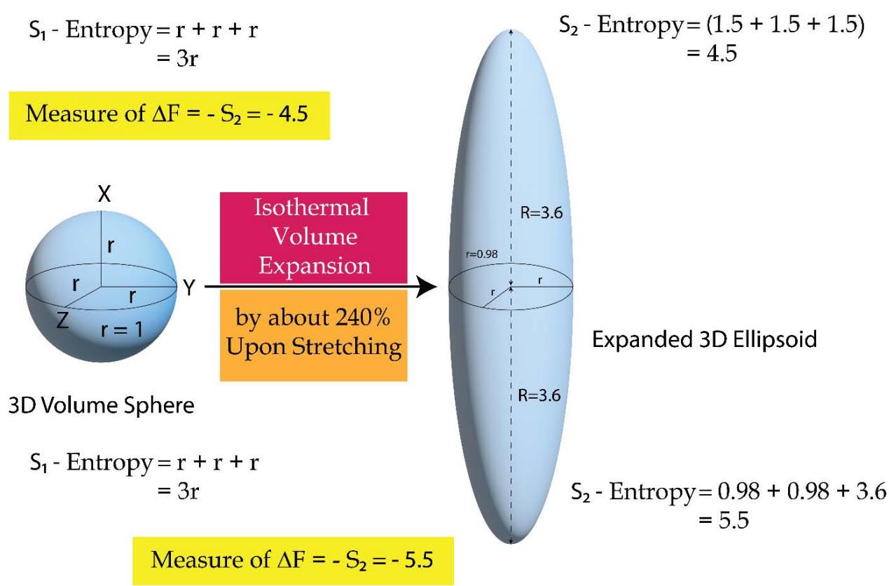 The most interesting case to observe is, if the system 2 instead of heating is being stretched isothermally and longitudinally by applying external force (such that the applied force is fully utilized for tensile elongation), the S will increase very fast (the muti directional entropy will decrease but the directional entropy will increase very much and will exceed the later) and as a result, the F will become more and more negative and that too very fast. The Nylon polymer can be stretched 200 to 300 times (before it breaks) of their original lengths and hence such systems would attain very high negative value of 'free energy' and would yield a considerable amount of 'thermodynamic work' indeed. In Figure19, the geometrical profiles of 'multi directional heat expansion' and 'directional mechanical stretching expansion' respectively of a system under isothermal conditions have been presented. In the upper part of the above said Figure, the heat expansion has been shown. The entropy of the system increases from 3r to $4.5\mathrm{r}$. In the lower part of the said Figure, the 'mechanical stretching' expansion of the same system has been shown and the entropy rises from 3r to $(2\mathbf{r}_1 + \mathbf{R})$, $r > r_1$ (since on directional stretching of a wire, the original cross section decreases to some extent).