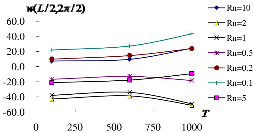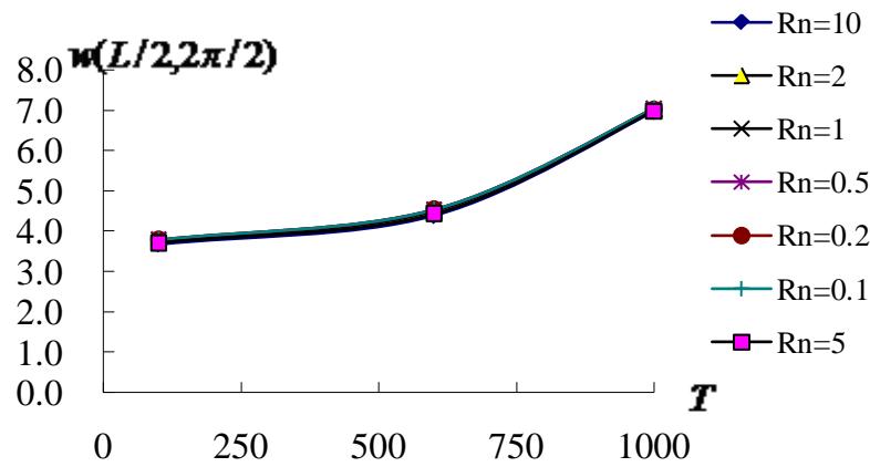 Fig. 4a: $w(L / 2,2\pi / 2)$ versus $T$ for $L / h^{*} = 5$ with $R_{n}$ from 0.1 to 10