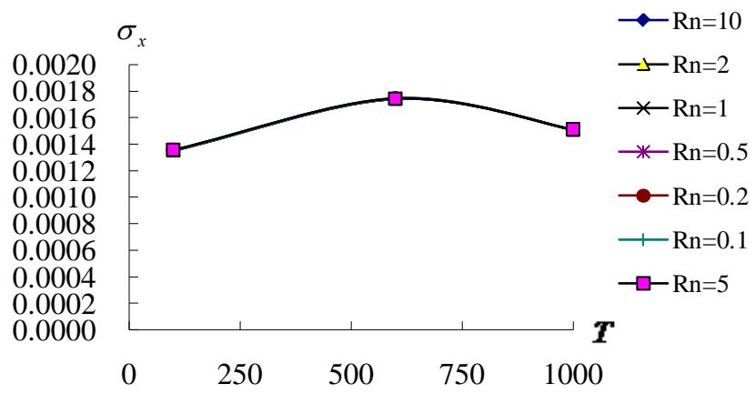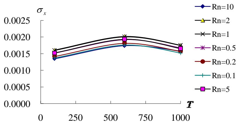 In Fig. 5 shows the $\sigma_{x}(\mathrm{GPa})$ on centre position of inner surface $z = -0.5h^{*}$ versus $T$ and all different values $R_{n}$ for the thermal vibration of thick $L / h^{*} = 5$ and 10 cases. Fig. 5a shows the curves of $\sigma_{x}$ vs. $T$ and $R_{n}$ for the $L / h^{*} = 5$ case, the values of $\sigma_{x}$ versus $T$ are all increasing from $T = 100\mathrm{K}$ to $T = 600\mathrm{K}$ and then all decreasing from $T = 600\mathrm{K}$ to $T = 1000\mathrm{K}$ for all value of $R_{n}$. The maximum value of $\sigma_{x}$ is 0.002018GPa occurs on $T = 600\mathrm{K}$ for $R_{n} = 2$. The stress $\sigma_{x}$ of the $L / h^{*} = 5$ can withstand for higher $T = 1000\mathrm{K}$. Fig. 5b shows the curves of $\sigma_{x}$ vs. $T$ and $R_{n}$ for the $L / h^{*} = 10$ case, they are all located in the same curves for all value of $R_{n}$, the values of $\sigma_{x}$ versus $T$ are all increasing from $T = 100\mathrm{K}$ to $T = 600\mathrm{K}$ and then all decreasing from $T = 600\mathrm{K}$ to $T = 1000\mathrm{K}$ for all value of $R_{n}$. The maximum value of $\sigma_{x}$ in 0.001745GPa occurs on $T = 600\mathrm{K}$. The stress $\sigma_{x}$ of the $L / h^{*} = 10$ can withstand for higher $T = 1000\mathrm{K}$.