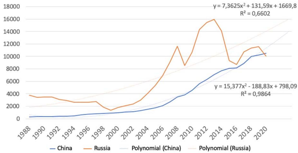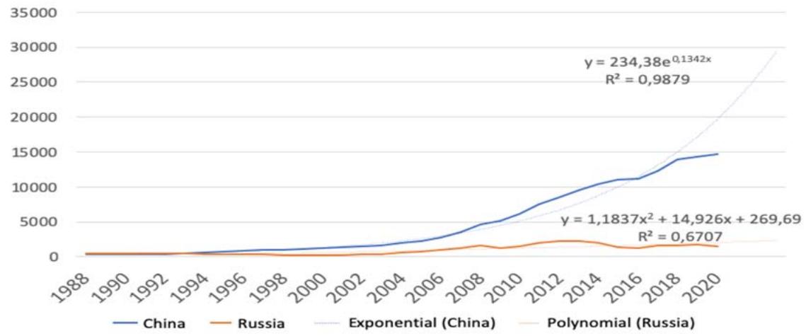 Fig. 2: GDP Growth Dynamics in Russia and China, 1988-2020, Billion US Dollars [Compiled by the Authors on the Basis of 27]