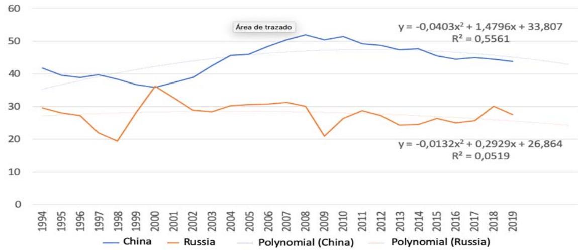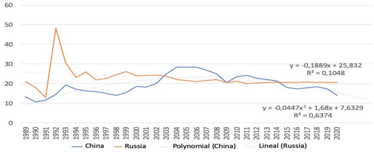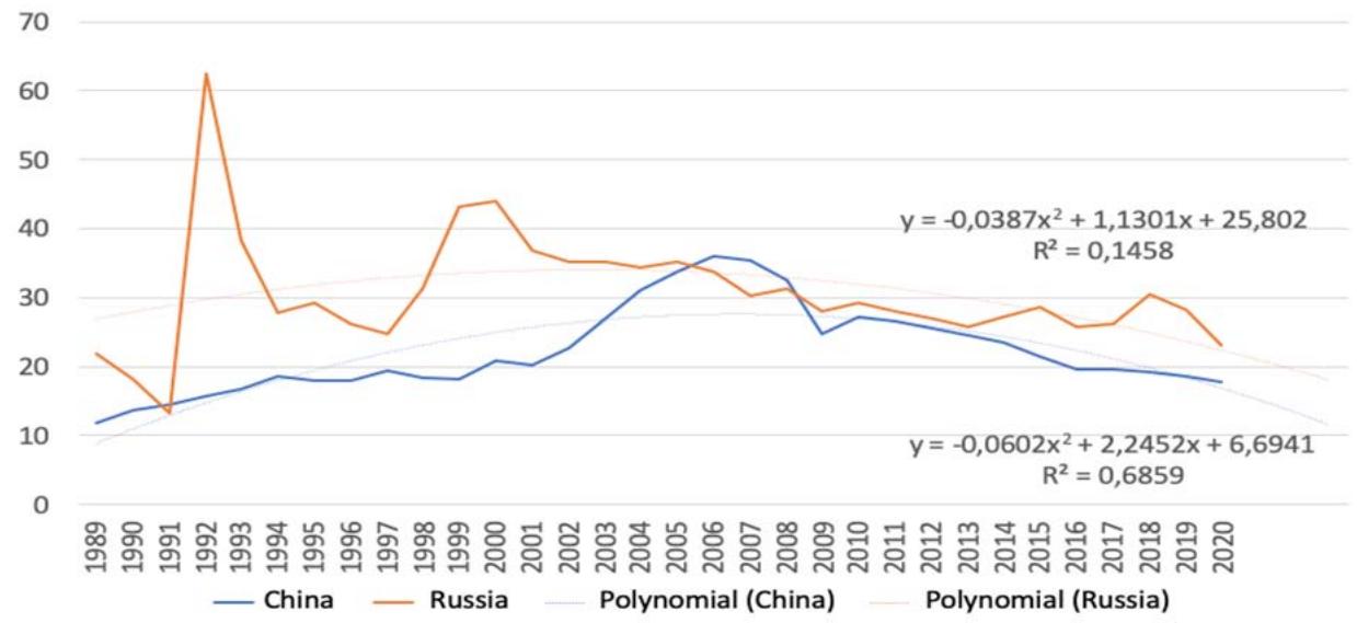 Fig. 6: Goods and Services Export Dynamics in Russia and China, 1989-2020, % of GDP [Compiled by the Authors on the Basis of 27]