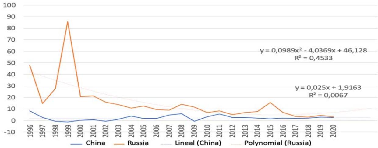 Fig. 5: Inflation Dynamics in Russia and China, 1996-2020, % of GDP [Compiled by the Authors on the Basis of 27]