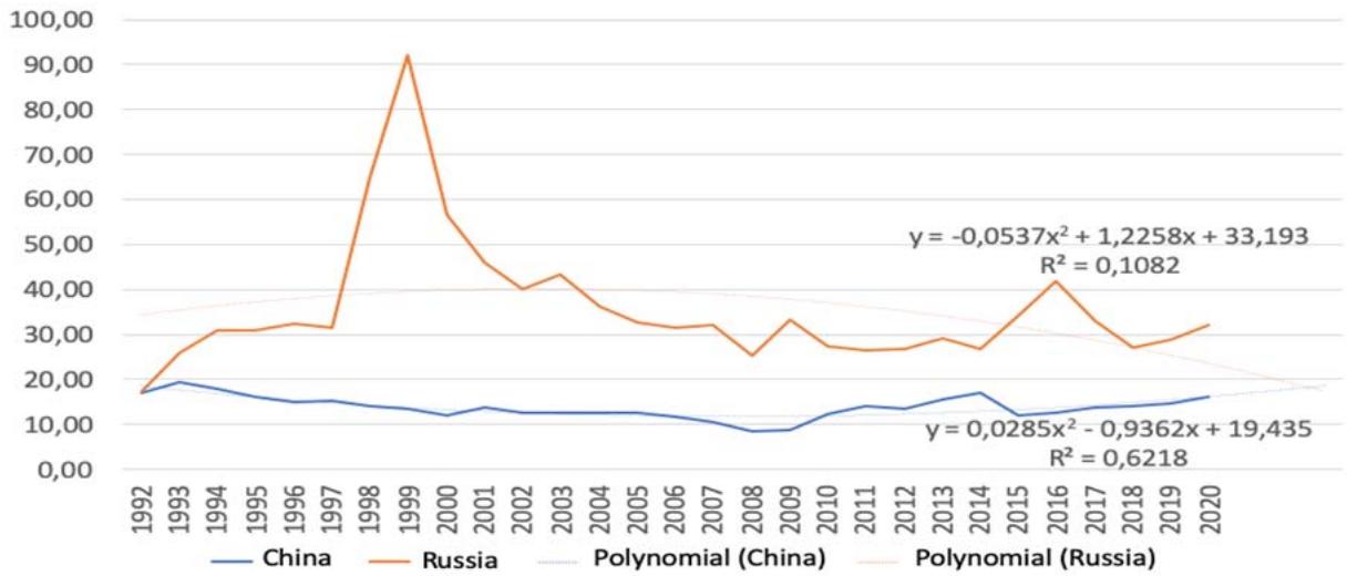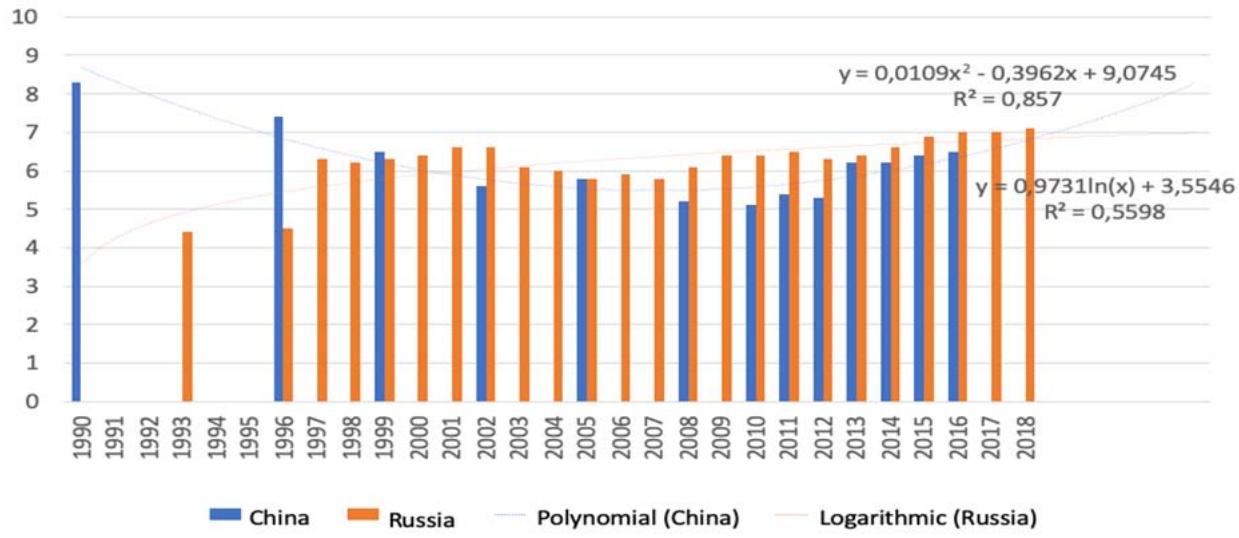 The economic systems of Russia and China are characterized by different dynamics of inflation rates in the period 1996-2019. For China, the annual inflation rate did not exceed $10\%$ and on average there is a trend towards its stability below $5\%$, which is a very good indicator for the developing economy. Inflation at this level provides growth in gross output and at the same time real income growth in the economy. For Russia, inflation indicators are on average about $10\%$ since 2003-2004. Prior to this period, hyperinflation was observed, which in general created a downtrend of this indicator. In general, it can be argued that after 2004 inflation dynamics, although it has a weak downtrend, inflation indicators remain relatively stable.
