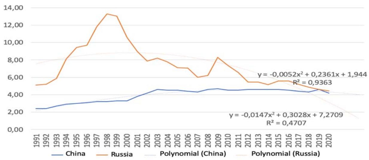 Fig. 11: The Unemployment Rate Dynamics in Russia and China, 1990-2020, % of the labor Force [Compiled by the Authors on the Basis of 27]