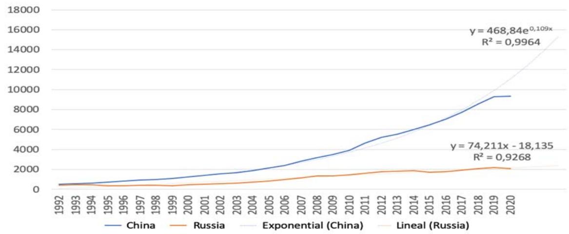 Fig. 9: Household Consumption Dynamics in Russia and China, 1992-2020, Billion US Dollars [Compiled by the Authors on the Basis of 27]