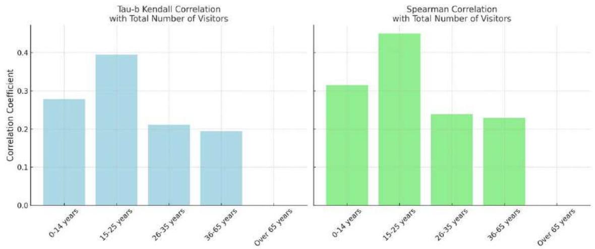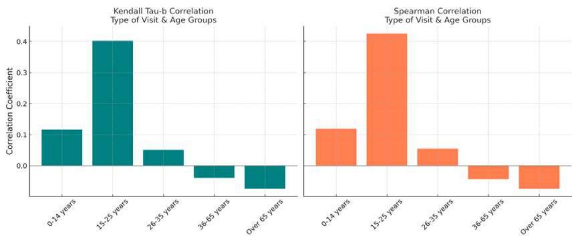 Figure 25: Charts showing the Kendall Tau-b and Spearman correlations between the type of visit and different age groups.