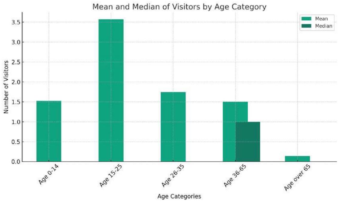 Figure 3: Bar chart showing the average and median number of visitors by age category.