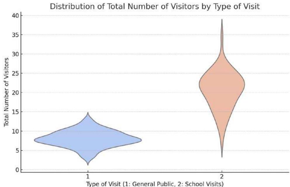 Figure 6: Violin chart combined with scatter points, showing the distribution of the total number of visitors by visit type to the Civil War shelters in Alicante.
