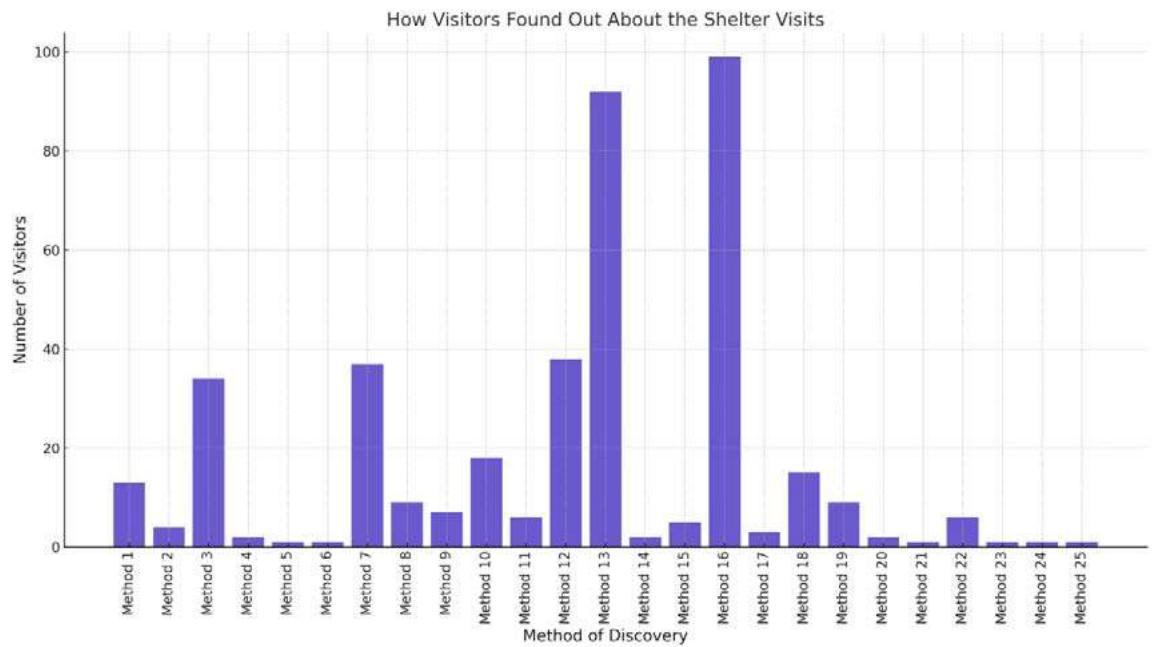 Figure 11: Bar chart showing how visitors learned about the shelter visits, using codes to represent the different methods.