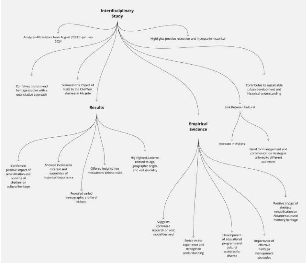 Therefore, the findings of this study not only contribute to the academic understanding of cultural heritage management in urban contexts but also highlight the potential of the Civil War shelters in Alicante as educational and tourist tools, fostering responsible tourism that values educational historical memory (Carretero & Borrelli, 2008; Ciro Solorzano & CaroLopera, 2020; Ciego, n.d.; Craggs et al., n.d.; Gabriel et al., n.d.; Gutierrez, 2019; Martinez-Rodriguez et al., 2022; Movellan Haro, 2022; Pappier & Morras, 2008; Restrepo Valencia & Espinosa Ortega, 2023).